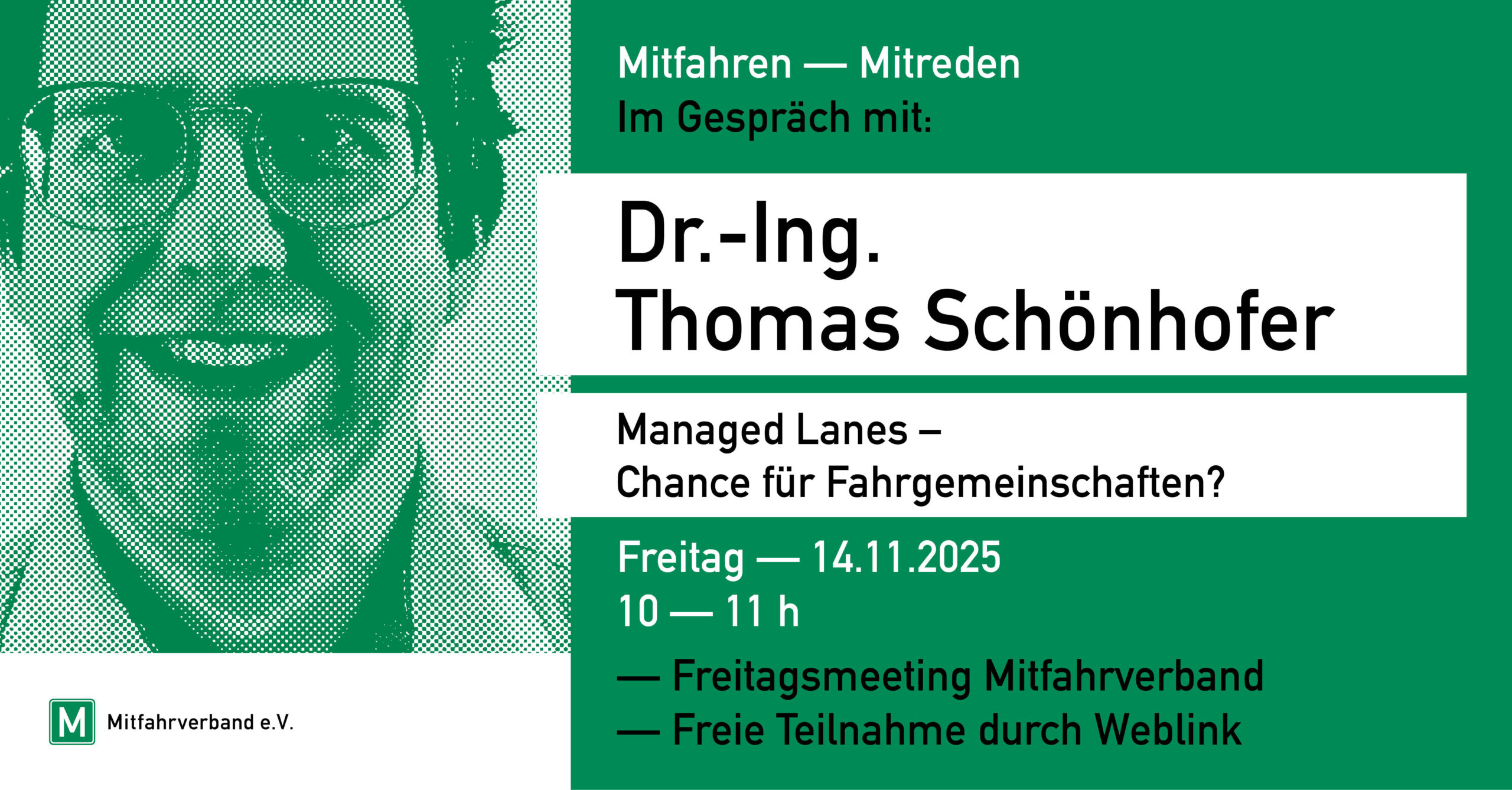 Am Freitag, den 14. November 2025, um 10 Uhr begrüßt der Mitfahrverband Dr.-Ing. Thomas Schönhofer in seiner Reihe „Mitfahren – Mitreden“ zum Thema „Managed Lanes – Chance für Fahrgemeinschaften?“